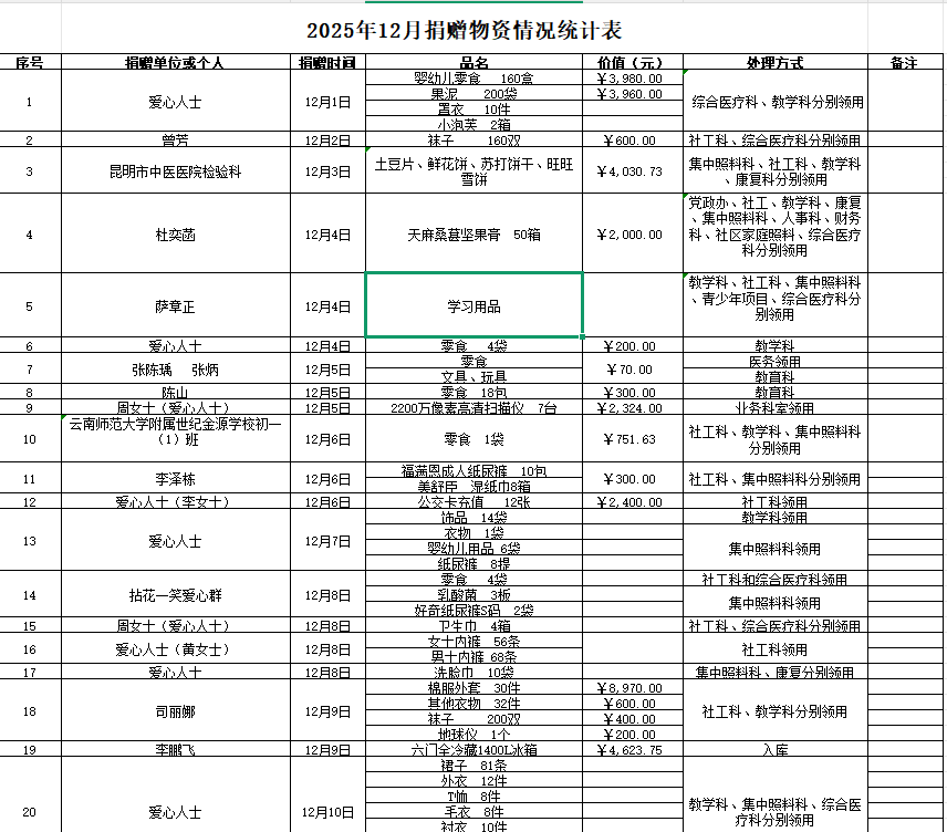 2025年12月物资捐赠情况公示