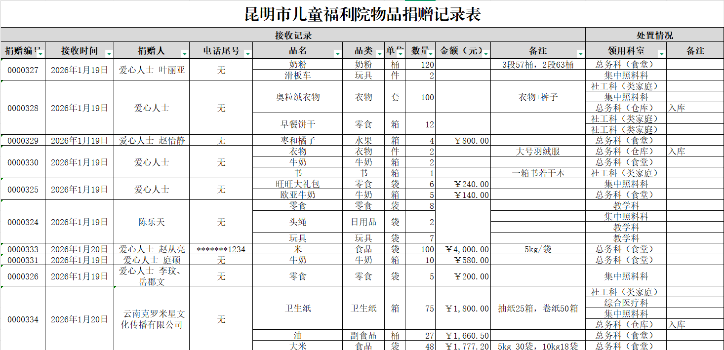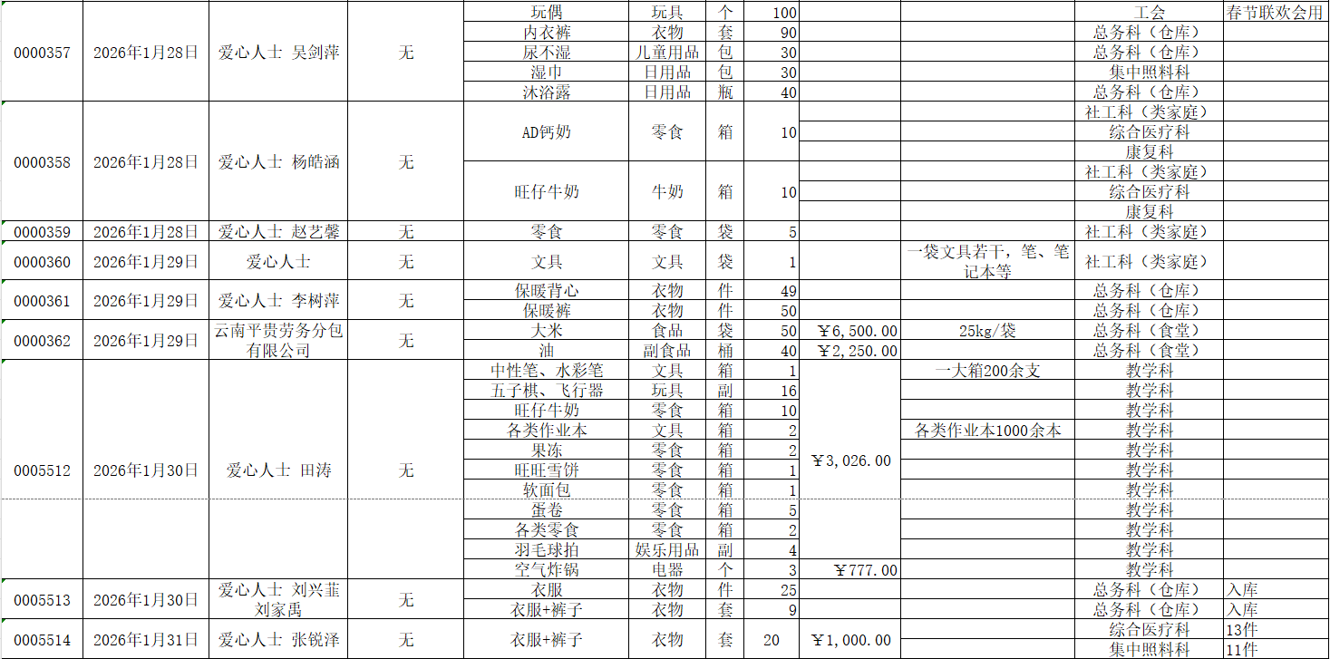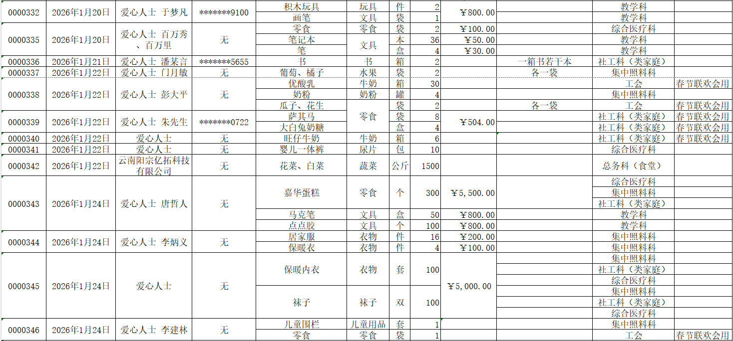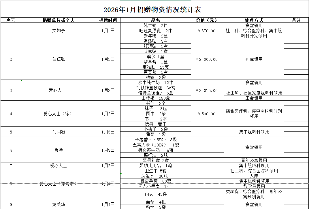 2026年1月接受物资捐赠情况公示